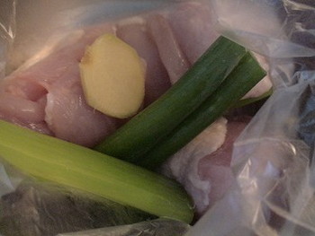 2.ポリ袋に鶏むね肉、香り酒の材料を入れて軽くもみこみ、冷蔵庫で1時間程度置く。