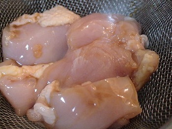 3.1時間程度経過したら、下味の酒・しょう油を入れ軽くもみ、ポリ袋からザルにあげて10分程度水気を切る。