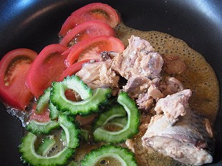 2.フライパンにトマト、1のゴーヤ、サバみそ煮缶を入れ、木べらなどで 崩しながら加熱します。