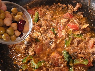 サバの味噌煮缶&お豆缶(ミックスビーンズ)、トマトにゴーヤも入ってます。