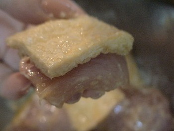4.鶏むね肉の片方の面に油揚げをのせて(写真右)、180度の油の中に、3~4分揚げ全体がキツネ色になったら、 取り出し余熱で火を通せば完成