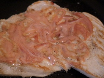 鶏肉の表面にマヨネーズ・ケチャップを混ぜ合わせたソースを塗り(写真右)、上にタマネギ、ピーマンを並べ、 ピザ用チーズをのせる。