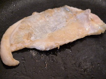 4.3の鶏皮から出た油をそのまま使って、フライパンに鶏むね肉・塩・コショウで味を付け、片面にしっかり焼き色がついたら、 ひっくり返す。