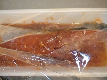 2. サケを生のまま、1の漬けダレに漬けてラップし冷蔵庫で30分置く。