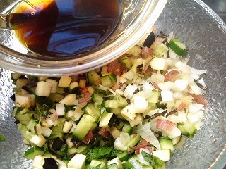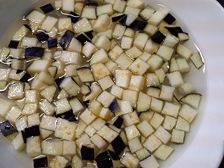 1.キュウリ、ナスは5mm角に切り、ナスは水にさらしてから、水気を絞ります。