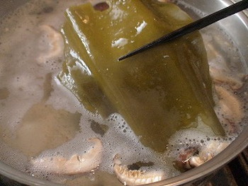 2.1を強火にかけ、細かい泡が出てきたら昆布を取り出し、沸騰したら中火に落とし10分煮る。