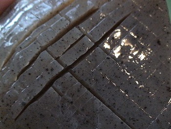 1.両面に隠し包丁を入れ、食べやすい大きさに切る。