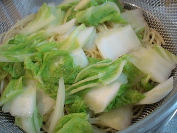 7.パスタが茹であがる1分半前に、1の白菜の「茎」の部分を入れ、30秒前に「葉」の部分も加えて茹でましょう。
