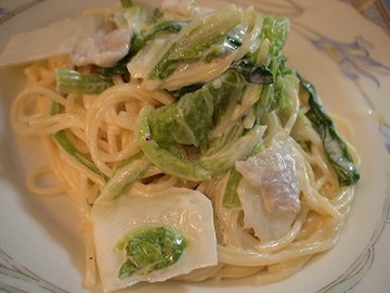 8.茹で上がったスパゲティと、白菜の水気を切って、一緒にフライパンのクリームソースと、あわせます。