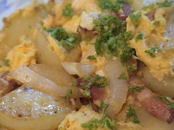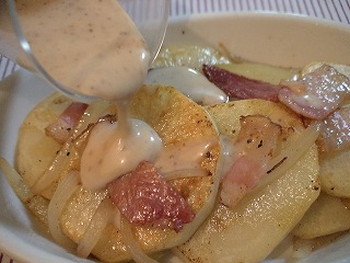 厚切りのベーコンやジャガイモをゆっくり、じっくりと焼き上げた、じゃが芋が大好きな国、ドイツの代表的・本格的メニューの【ジャーマンポテト】も作ってみました。レシピは続きです。