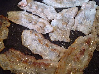 3.フライパンに油をひき(分量外)、豚肉を炒めます。いい焼き加減になったらお皿に上げます。