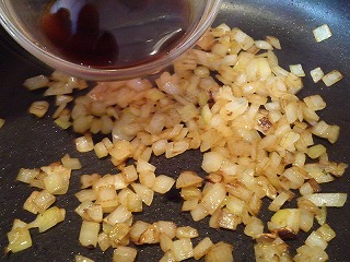 4.3のフライパンに玉ネギを入れて、中火で5分ほど炒めます。透明になってきたら1の合わせだれを入れて煮からめます。