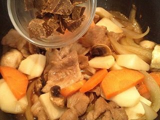 野菜に油が回ったらルゥを細かくして加え溶かします。