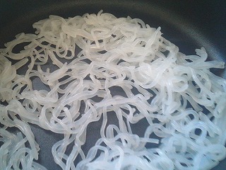 3.フライパンに長さ3cmくらいに切ったしらたきを入れて、水分を飛ばしながら、から炒りします。