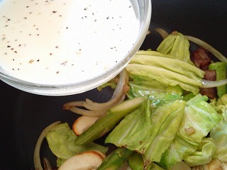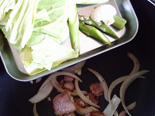 4.3のフライパンにベーコンを中火で炒めた、脂が出てきたら、ニンニク、タマネギ、キャベツ、アスパラガス、塩、マッシュルームを入れて炒めます。