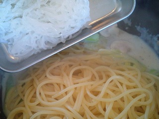 6.とろみがついたら、粉チーズ、1の茹でたパスタ、3のしらたきを加え、ソースによく絡ませます。