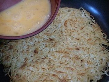 卵を2回に分けて、麺の両面から溶き卵をまわしかける調理法(卵で麺をサンドする感じ)をアップしていました。