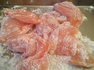 1.鶏むね肉は食べやすい大きさにスライスし、小麦粉をまぶしておきます。