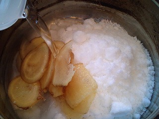 1.鍋に2ミリくらいの厚さにスライスしたショウガ、水、砂糖を入れて火にかけます。