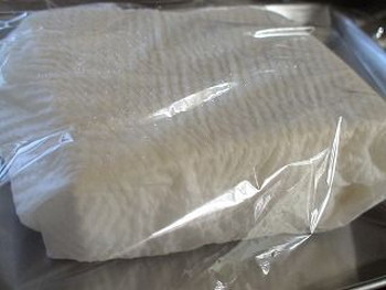 4.siotofu3クッキングペーパーで豆腐をくるんで、ラップをかけて密閉し、冷蔵庫で24時間ほど冷やします。