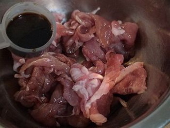1.豚こま肉はしょう油を回しかけ、まんべんなく揉み込んでおく(写真右)。