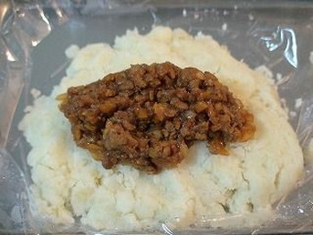 4.ラップ30cmの上にジャガイモを100g程度のせ3の具材を適量のせます。