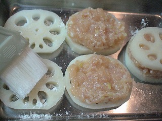 3.れんこんの表面に(肉だねをのせる面)片栗粉をまぶします(右写真:左側)。