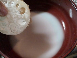 6.4のレンコンを食べやすい大きさに切り(放送:4等分)、器に盛り付け5のからし酢あんをかけます。