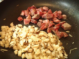 2.フライパンに牛脂を入れて、エリンギ、マッシュルーム、しめじを炒め、さらに塩・コショウで下味を付けた牛肉を加えて炒めます。