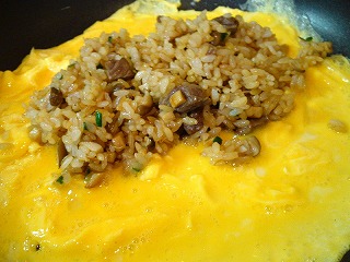 よくかき混ぜて、半熟の状態で3をのせて卵で包めば【オムライス】の出来上がり