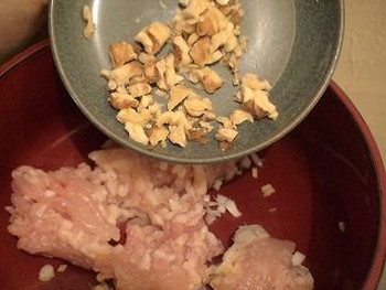 2.ボウルに鶏ひき肉、しょうが、ねぎ、ピーナッツを入れる(くるみを代用しました)