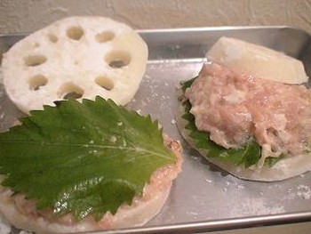 4.1のれんこんに、3のたね⇒大葉⇒3のたね⇒1のれんこんの順にはさむ