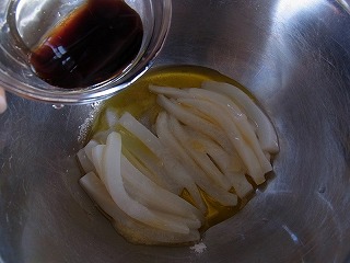 2.1のイカそうめんをボウルに入れ、そこに(A)の塩・オリーブオイル・バルサミコ酢・レモン汁・しょうが汁を加えます。