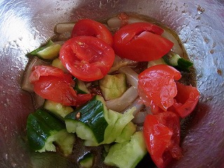 3.手でつぶして(めん棒で叩くなど)ひと口大に切ったきゅうり、半分に切って手でつぶしたミニトマト、細かく切ったバジルを2に加え、混ぜたら少し冷やしておきます。