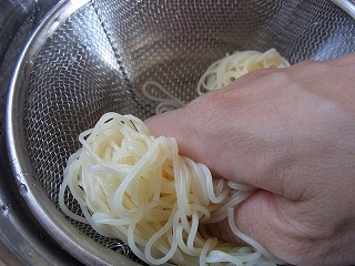 5.4の茹で上がったパスタを氷水で冷やし、ザルに押し付けながら水分を切ります。