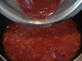 3.沸騰したら、ケチャップを加え、さらに弱火で10分ほど煮込みます。