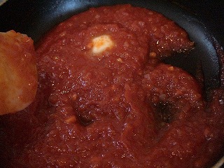 2.ニンニクが色付いてきたら、タマネギ、ホールトマトを加え、沸騰するまで中火で煮込む。
