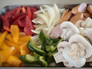 4.パプリカ、タマネギ、チョリソを1cm幅の斜め切り、マッシュルームはスライスします。