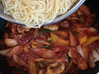 6.具に油が絡んだら、3のナポリソースを加え約7~8分煮込む。
