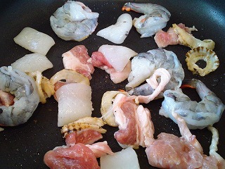 4.熱して油を馴染ませた鍋で、野菜を軽く炒めたら、魚介、肉、酒、中華スープを加えます。
