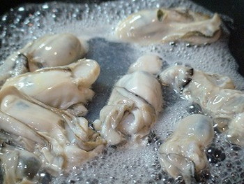5.温めたフライパンに牡蠣を入れ、牡蠣から出た水分が沸いてきたら、白ワインを加える(中火)