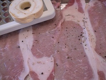 2.肉の上から車麩をおろし金で削り、岩塩、ブラックペッパーで味付けをする。