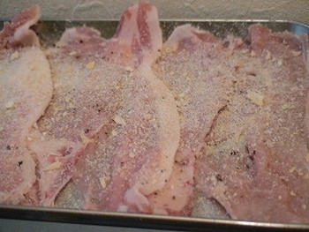 1.肉の脂身部分を互い違いに並べ、その上に砂糖水を付ける。