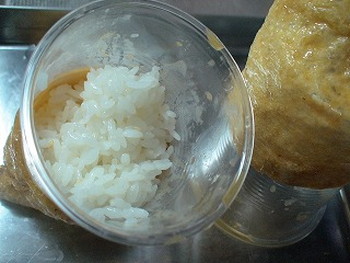 ※ご飯をいなりに詰める時短テク!⇒底の抜けた使い捨てコップの飲み口からご飯を入れれば、手も汚れない。