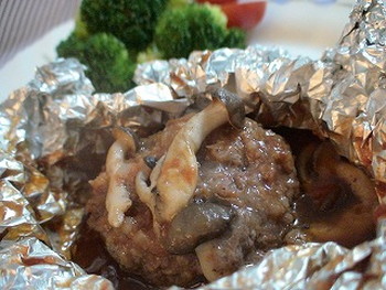3.アルミホイルにシメジ、トマトジュース、お好み焼きソースを入れ、グリルで15分焼く。