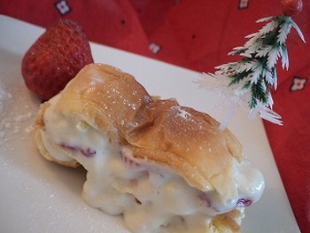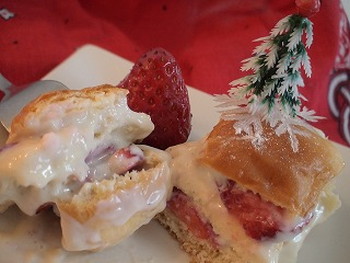 タッパーなど)に、2のクロワッサン生地→1のカスタード→3のイチゴ→クロワッサン→カスタード→イチゴ→クロワッサンの順に敷きつめる。