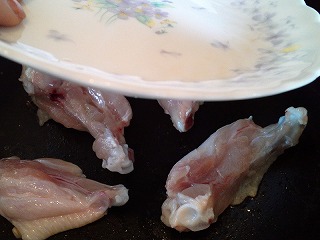 フライパンに皮を下にしてカリッとなるまで、鍋の蓋などで手羽先を押さえつけながら焼きます。