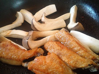 4.手羽先を返して火を通します。フライパンの空いた所で、エリンギを加えて炒めます。