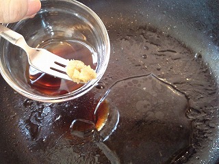 6.4の使ったフライパンに、水、ポン酢しょうゆ、柚子胡椒を入れてひと煮立ちさせドレッシングを作ります。