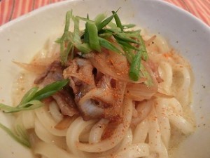 5、(4)に(3)をのせ、青ねぎをのせ、七味唐辛子(適量)をふり 【豚肉のかま玉うどん】の出来上がり 。